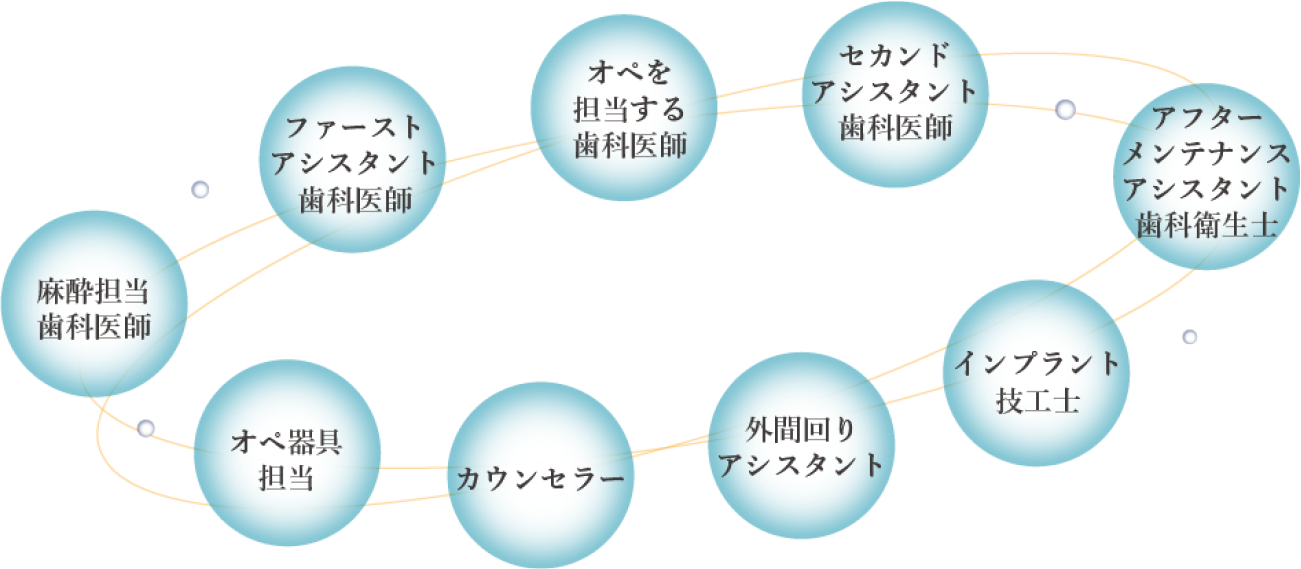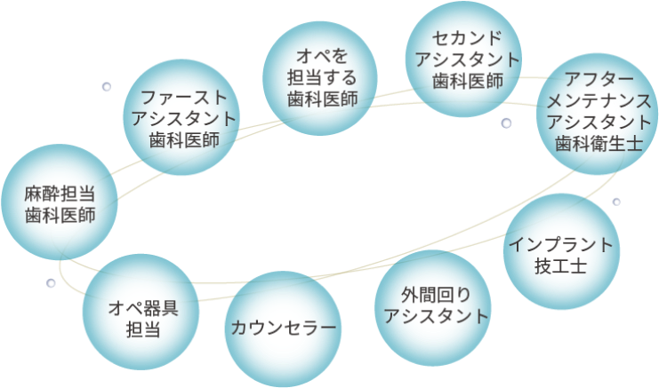インプラント治療は、専門的な知識と技術を必要とします。岩手県盛岡市のマモインプラントクリニックマリオスでは、カウンセリングから精密検査、診断、手術、術中の管理、その他治療、術後のケアまで、高い専門性を持つスタッフ同士で連携して行っています。小さな見逃しや判断ミスを最小限に減らし、より安全性の高い治療を実現します。