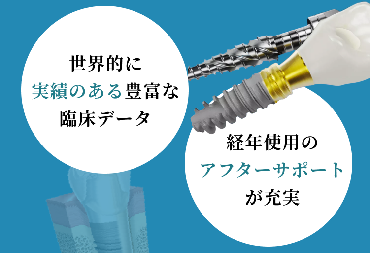 インプラントは「埋めれば同じ」ではありません。近年では、安いインプラントも出回っていますが、安いことには必ず理由があります。インプラントメーカーの違いは、治療精度、噛み心地、長期的な安定性にも影響します。当院では、世界的に信頼性が高く、安全性や治療後の安定が確立された、常に先端を走る世界のインプラントのパイオニアと言われている「ノーベルバイオケア製」インプラントを使用しています。